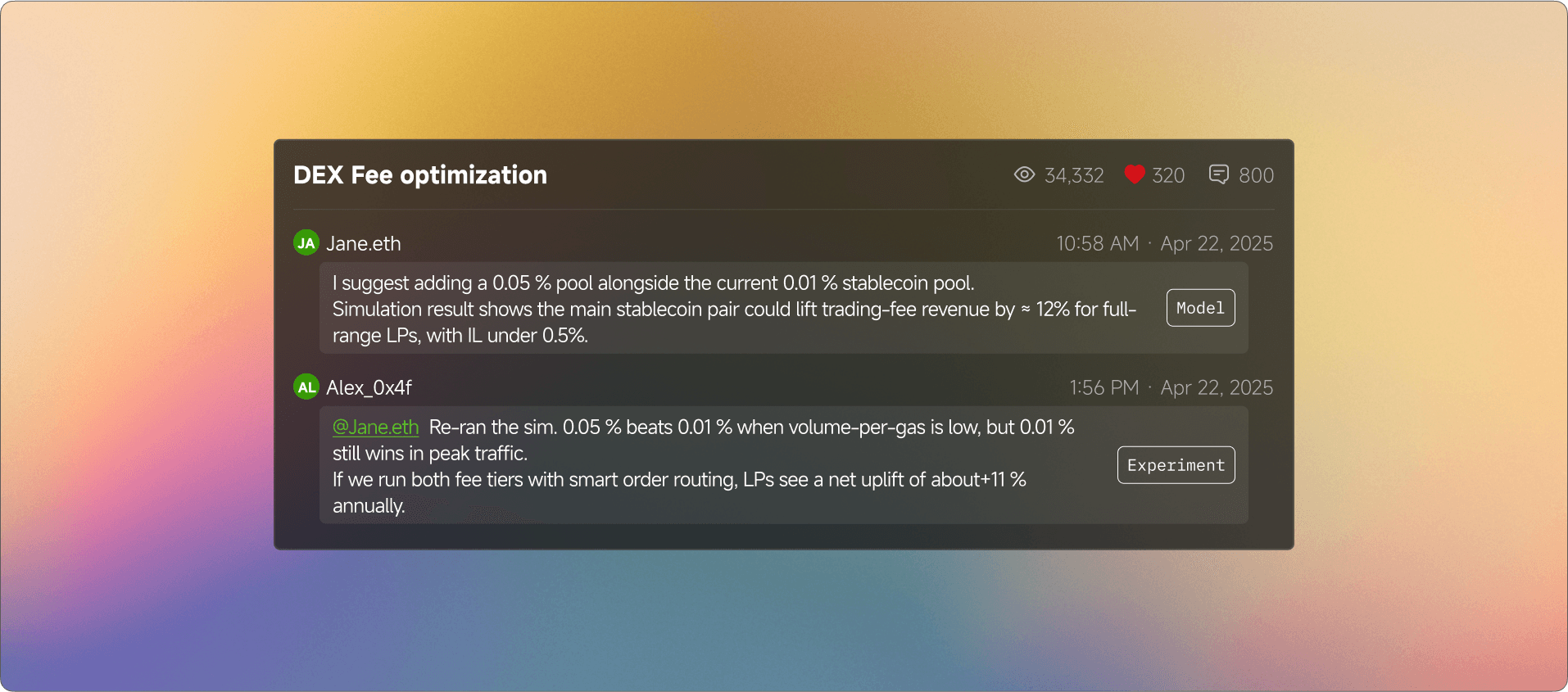 Fork a model to propose alternatives. Debate shifts from words to outcomes.